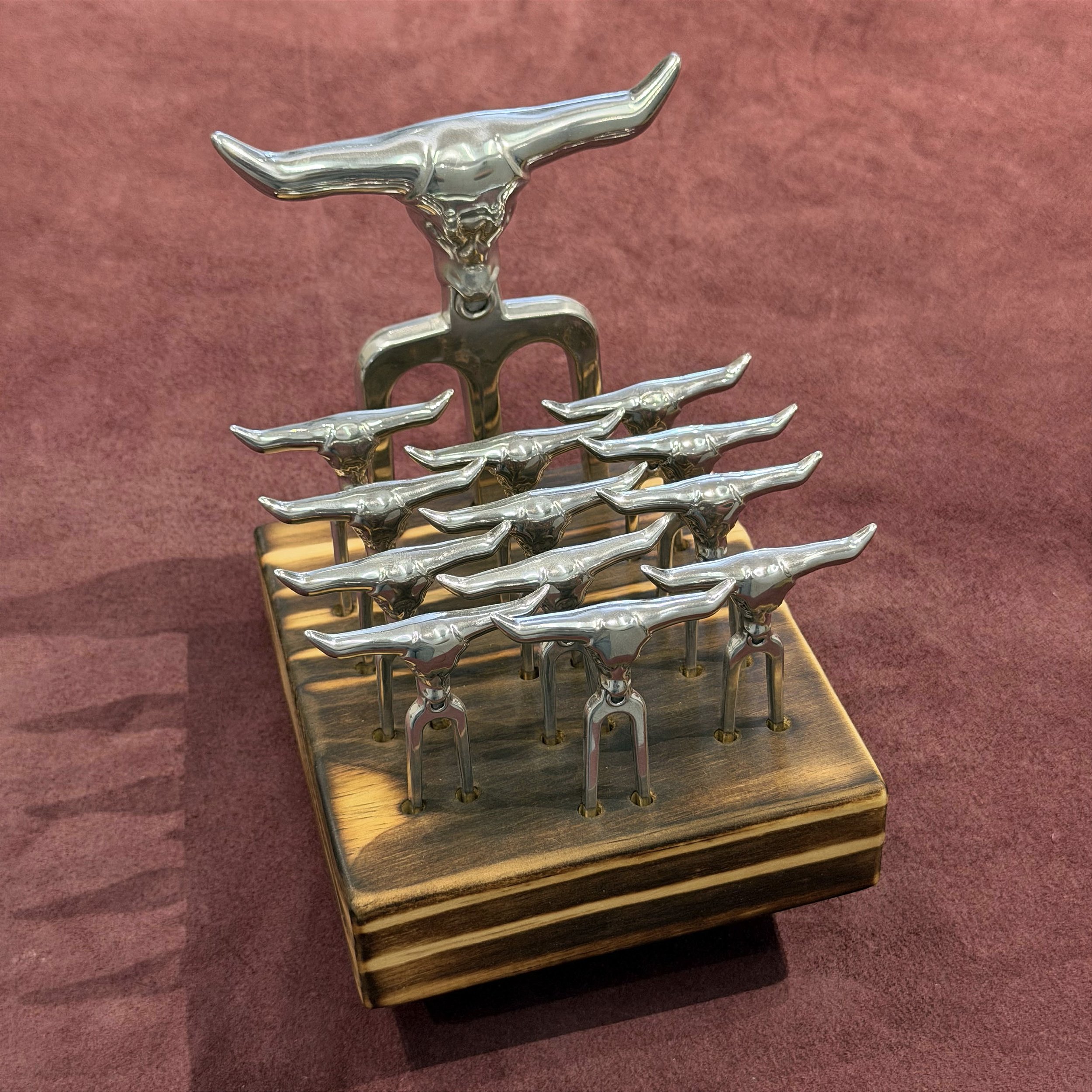 O conjunto petisco com 13 peças é composto por uma Garra Tridente e 12 Garrinhas menores de petisco, todas com cabeça de boi. Fabricado em alumínio de alta qualidade, une originalidade no design à resistência e praticidade, tornando-se uma excelente escolha para churrascos ou para compor uma decoração.