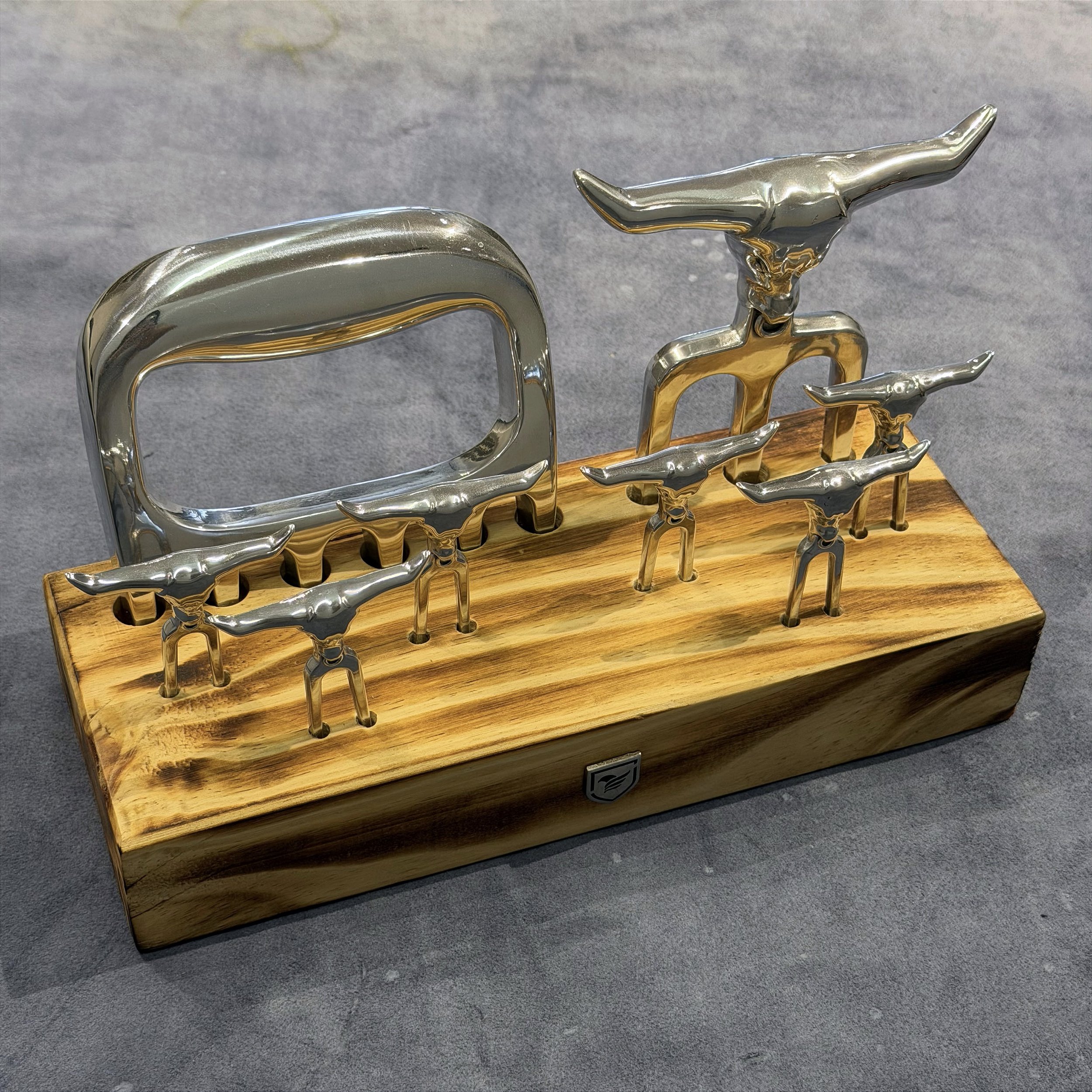 O conjunto petisco com 8 peças é composto por uma Garra Tridente de Boi, Garra Pata de Urso e 6 Garrinhas menores de petisco, todas com cabeça de boi. Fabricado em alumínio de alta qualidade, une originalidade no design à resistência e praticidade, tornando-se uma excelente escolha para churrascos ou para compor uma decoração.