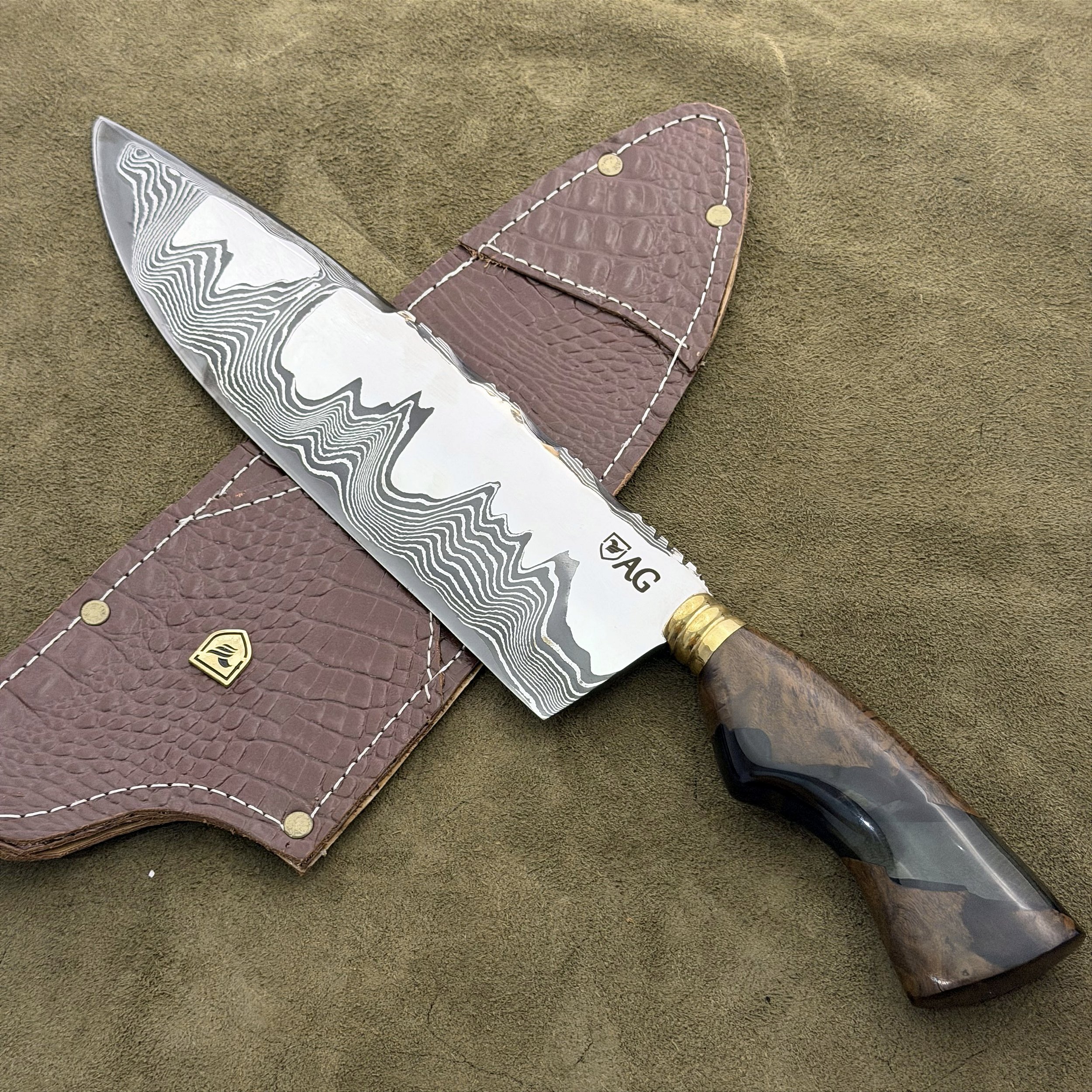 Peça única estilo picanheira, modelo espiga oculta com 10 polegadas em aço damasco de padrão aleatório com o dorso de 8mm e botão dourado.