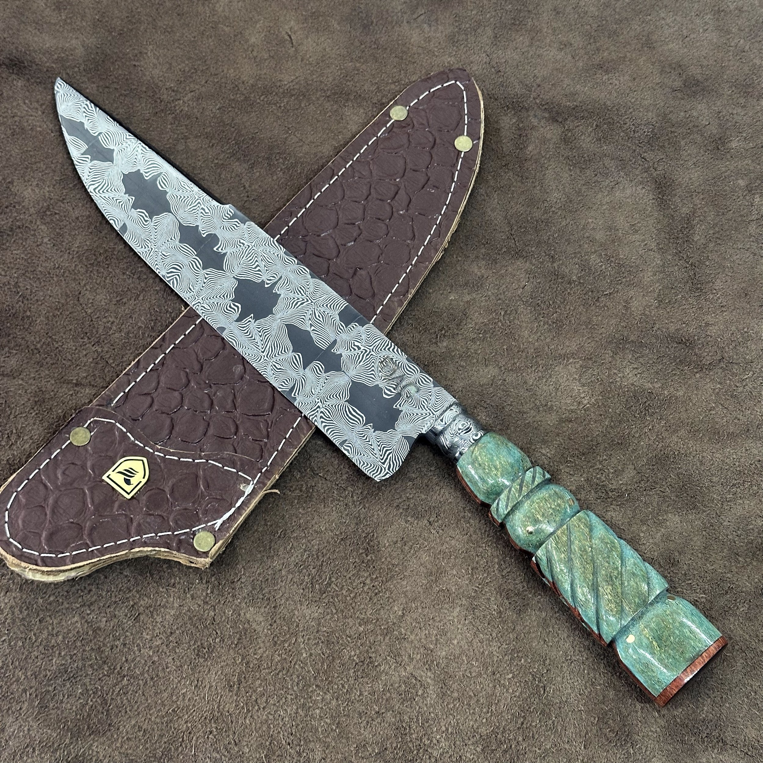 Peça única estilo churrasco, modelo espiga oculta com 10 polegadas em aço damasco de padrão mosaico com botão integral e dorso de 5mm.