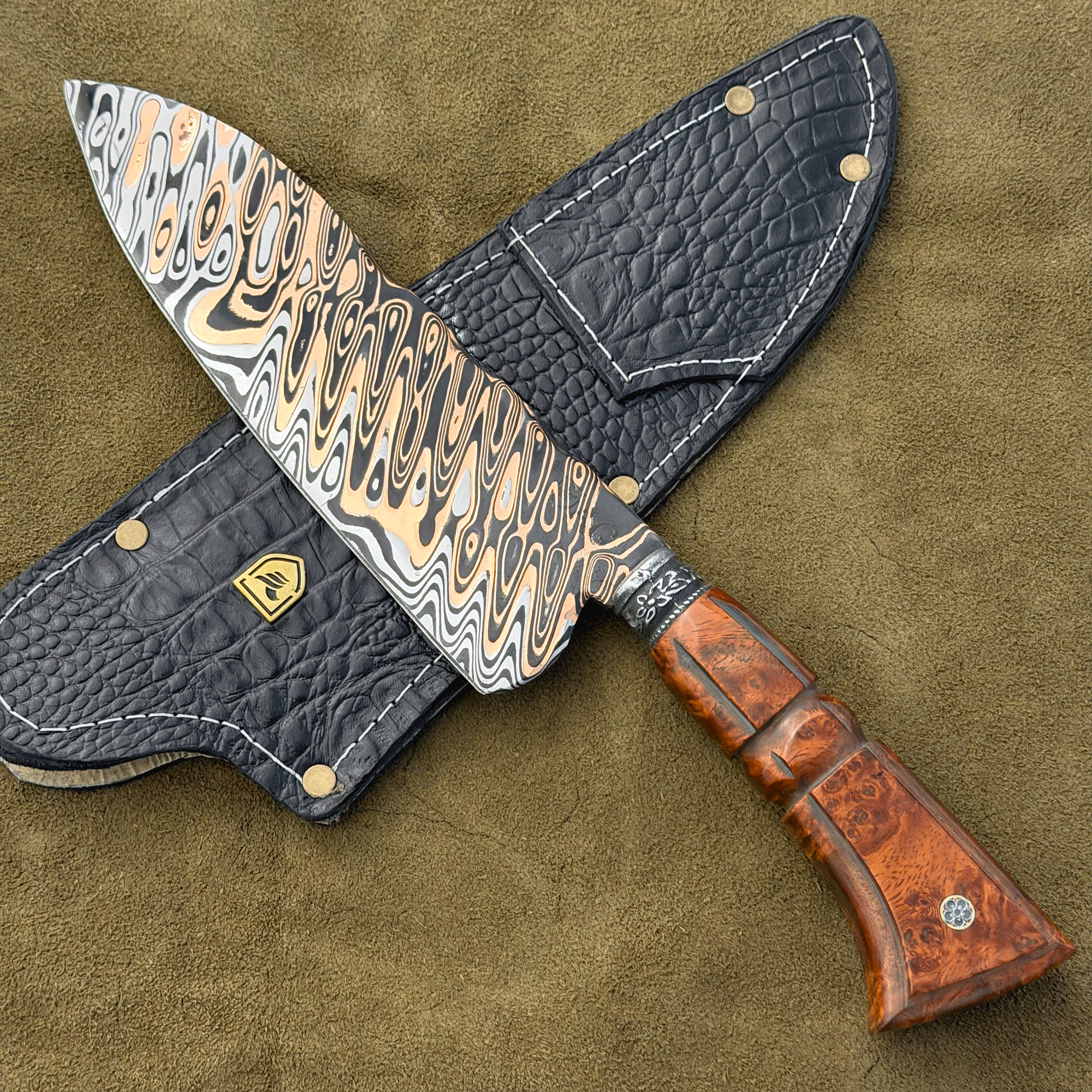 Peça única estilo picanheira, modelo espiga oculta com 8 polegadas em aço damasco mokume-gane (camada de cobre) com padrão aleatório, botão trabalhado em prata velha e com o dorso trabalhado de 4mm.