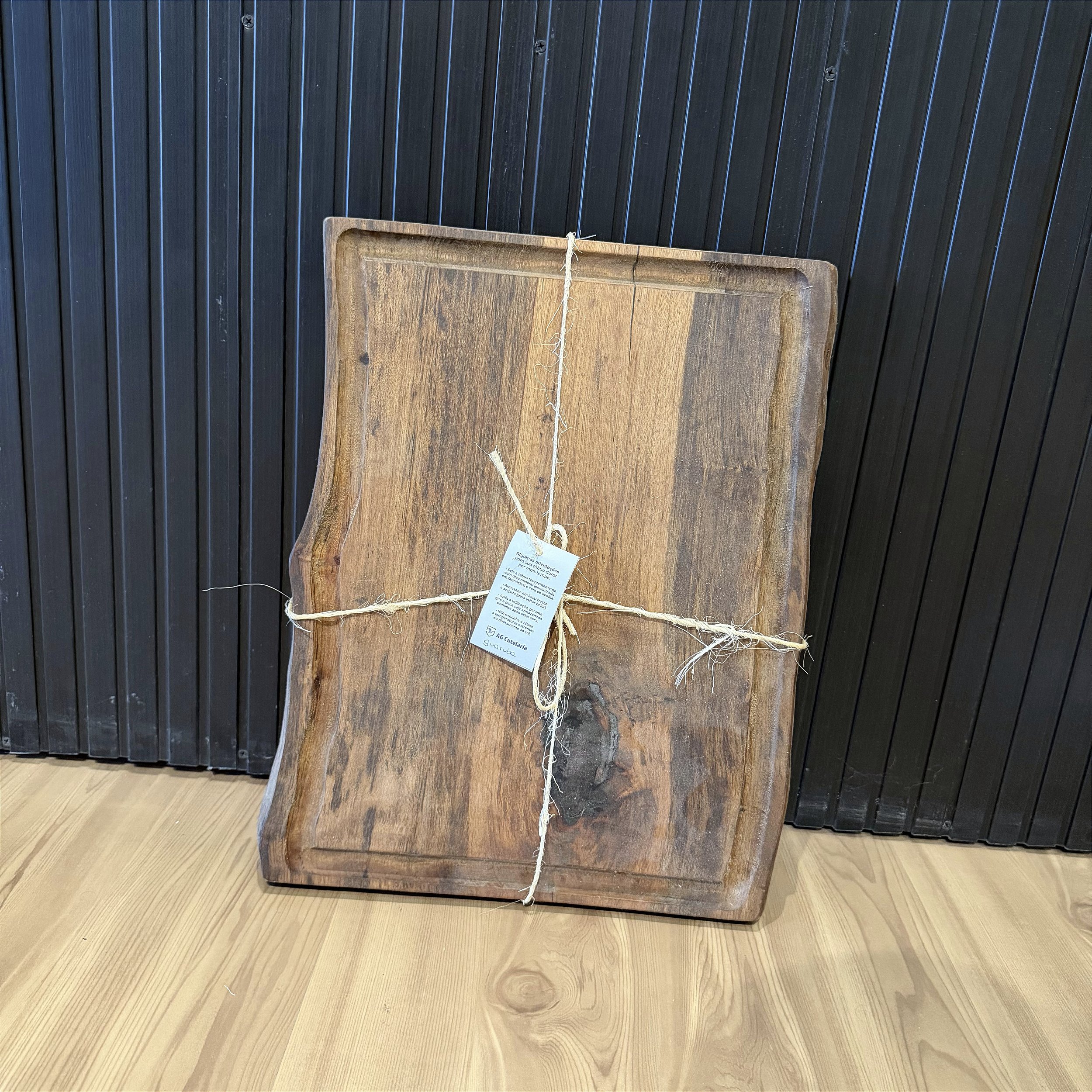 Tábua de corte artesanal em madeira Guaruba, rica em textura e com canaleta funcional.