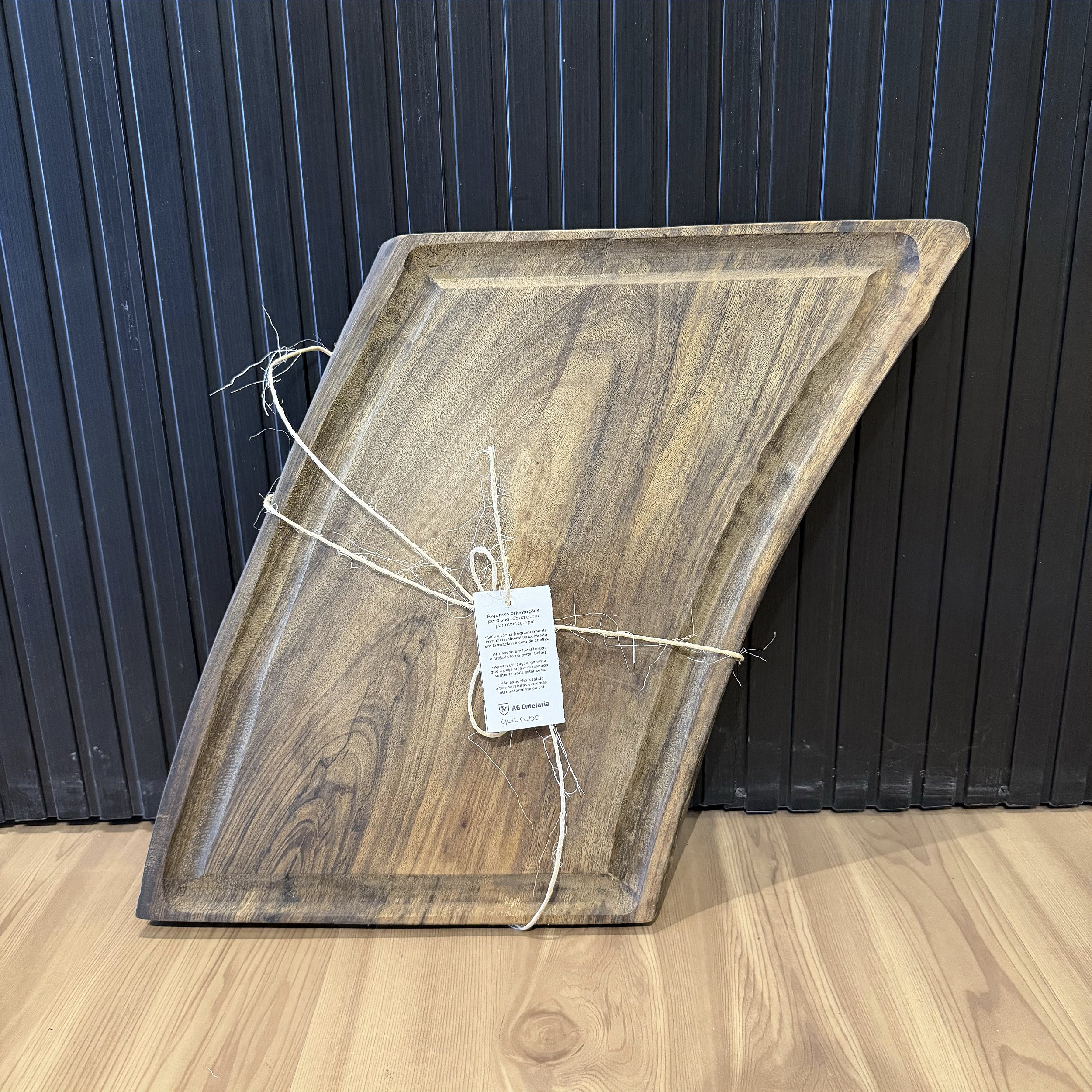 Tábua de corte artesanal em madeira Guaruba, rica em textura e com canaleta funcional.